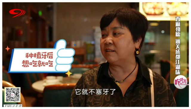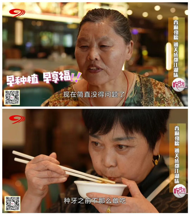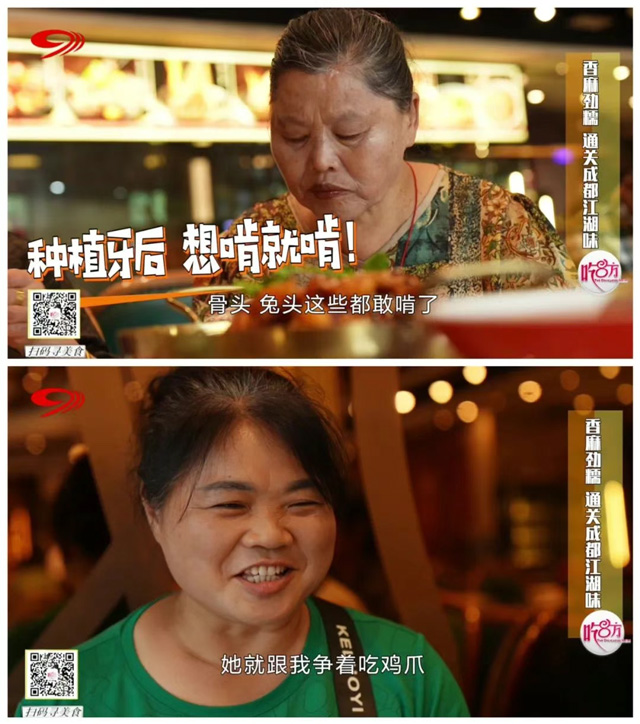 第一關便為大家呈上了主打招牌菜——情妹耙泥鰍,軟彈魚皮下的嫩肉在滾燙紅油中被煮到軟爛,麻辣湯汁則是浸入每一絲肉縫,只有牙口好才能品出這一層疊的香。菜品上桌,只見團員們毫無懼色,嚼得歡快過癮。陳阿姨表示:“種牙之前不那么敢吃,因為這個吃了牙齦要發(fā)炎要痛。”曾經飽受缺牙痛苦的劉阿姨,如今種好牙后也能細細品味,并表示:“現(xiàn)在簡直沒得問題了,吃起來多好的!”