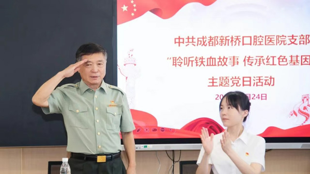 中國共產黨成都新橋口腔醫院支部委員會宣傳委員、新橋口腔臨床一線的黨員醫生代表王學鋒在發言中表示,“老一輩革命軍人用鮮血和生命換來了今天的和平與繁榮。作為新時代的醫務工作者,我們肩負著守護生命健康的重大責任,我們要傳承他們的精神,團結協作,做好群眾口腔健康的‘守門人’,用專業與責任踐行醫者使命。”