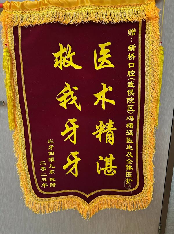 馮楮涵醫(yī)生強(qiáng)調(diào):“小文的情況是個(gè)很好的正面教材。齲齒作為最高發(fā)的口腔疾病,初期往往不痛不癢,容易被忽略。但他一發(fā)現(xiàn)異常就及時(shí)就醫(yī),這為我們爭(zhēng)取了實(shí)施保守治療的機(jī)會(huì)窗口。如果一拖再拖,等到牙髓發(fā)生感染、出現(xiàn)自發(fā)痛或夜間痛,那時(shí)就真的只能進(jìn)行根管治療了。早一步處理,不僅痛苦小、療程短,更意味著更多的治療選擇和更好的遠(yuǎn)期效果。”治療結(jié)束后,小文對(duì)效果非常滿意,特意定制了錦旗表達(dá)謝意。“這面錦旗不僅是感謝他們能理解我的顧慮,更是希望他們的專業(yè)和耐心能幫助更多人。”