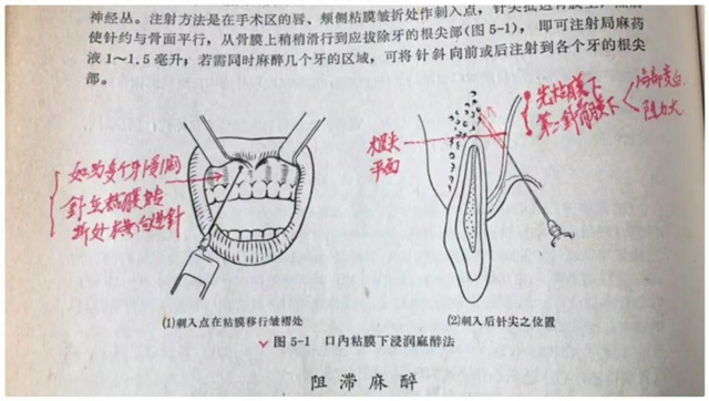 包括上牙麻醉、下牙麻醉的操作技巧,如何避開附近的神經(jīng),避免和減少并發(fā)癥發(fā)生,他一一結(jié)合口腔解剖圖進(jìn)行了詳細(xì)的講解,包括上牙槽后神經(jīng)阻滯麻醉口內(nèi)注射法、口內(nèi)粘膜下浸潤麻醉法、眶下神經(jīng)阻滯麻醉口外注射法、眶下神經(jīng)阻滯麻醉眶下孔口內(nèi)注射法、鼻腭神經(jīng)阻滯麻醉、下牙槽神經(jīng)阻滯麻醉等。